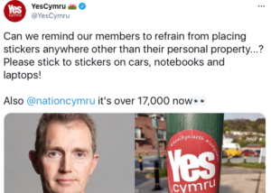 There is also mounting hostility to the appearance (illegally) of YC stickers on lamp posts and road signs. The Monmouth MP and Welsh office minister David TC Davies said: “I’m frankly sick of YesCymru stickers being placed all over signs and buildings in Wales”. Mr Davies, has been an MP continuously since May 2005, and currently holds the UK Government posts of Parliamentary Under-Secretary (Wales Office), as well as Assistant Whip.