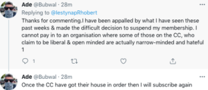 These are not the only casualties of the astonishing fight within YC either. One senior member who has recently been suspended from the Central Committee of YC, eminent clinical psychologist Dilys Davies, suffered enormous abuse online (with her having to ‘protect’ her Twitter account) after making remarks which appeared to inflame an opposition group within YC.