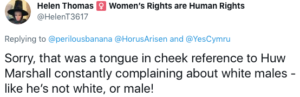 In a tweeted reply to YC, she said: “Sorry, that was a tongue in cheek reference to Huw Marshall constantly complaining about white males – like he’s not white, or male!