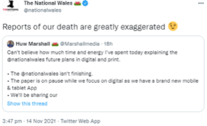 Perhaps living in a world of fantasy, this was in response to Mr Marshall saying, also on Twitter that “The @nationalwales isn’t finishing.