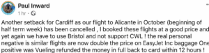 Another FB message, again from a different critic, was sent directly to CA, and also highlighted the problems. It stated angrily: “I resent flying from Bristol..”.