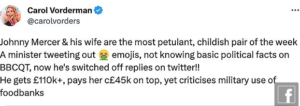 The former Countdown presenter described the then Conservative UK Government as “a lying bunch of greedy, corrupt, destructive, hateful, divisive, gaslighting crooks”, and used Twitter/X to call Conservative MP Johnny Mercer and his wife “petulant” as well as “childish”.