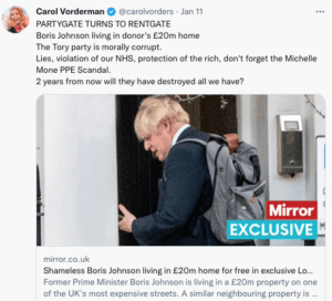 In the past she has proclaimed on Twitter/X “The Tory party is morally corrupt”. In her tweet, she attached a Mirror story with photograph, which stated: “Shameless Boris Johnson living in a £20m home for free…”.