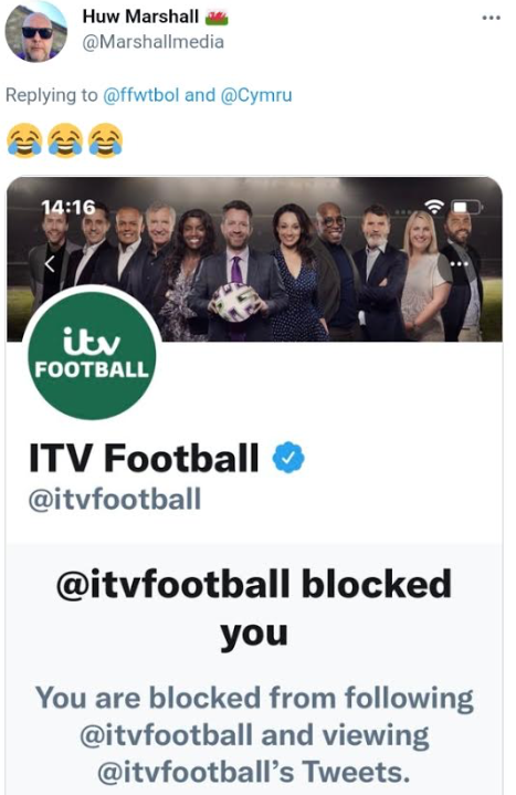 In banning Mr Marshall ITV Football warned him: “You are blocked from following @itvfootball and viewing @itvfootball’s Tweets”.