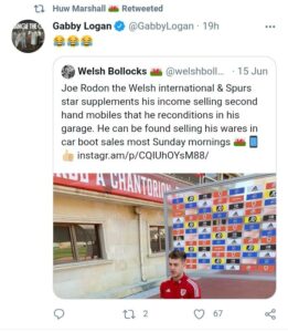 That however did not stop the famous television sports presenter Gabby Logan endorsing one of his ‘Welsh Bollocks’ tweets.