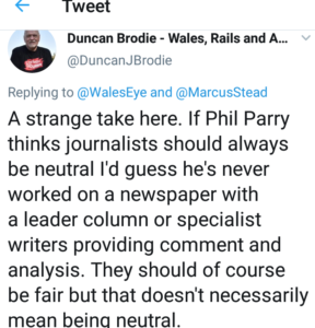 As one critic put it on Twitter:  “If Phil Parry thinks journalists should always be neutral I’d guess he’s never worked on a newspaper with a leader column or specialist writers providing comment and analysis”.