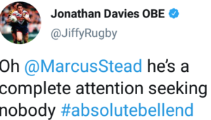 Welsh rugby legend Jonathan Davies has engaged in an extraordinary spat on social media in which he branded a critic an “attention seeking nobody”, a “sad pathetic waste of time” and ‘hashtagged’ the words “absolute bell end”, it has emerged.