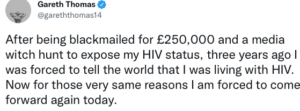 He said yesterday on Twitter: “After being blackmailed for £250,000 and a media witch hunt to expose my HIV status, three years ago I was forced to tell the world that I was living with HIV. Now for those very same reasons I am forced to come forward again today”.