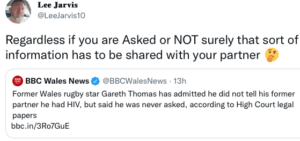 The former Welsh rugby international, Lee Jarvis, included the BBC report, and tweeted: “Regardless if you are Asked or NOT surely that sort of information has to be shared with your partner (confused emoji)“.