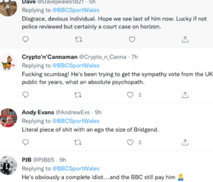 Another remark in reply to BBC CW was: “Fucking scumbag! He’s been trying to get the sympathy vote from the UK public for years, what an absolute psychopath”.