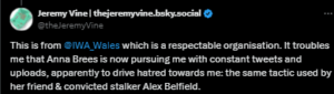 There was a testy online exchange with Mr Vine over disgraced Alex Belfield, in which Mr Vine said: “It troubles me that Anna Brees is now pursuing me with constant threats…”.