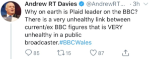 The former leader of the Welsh Conservatives (WC) (now reinstated) in the Welsh Parliamnt/Senedd Cymru (WP/SC) Andrew RT Davies, MS, has in the past accused, on social media, BBC CW of a “link” with PC, and that it was “unhealthy”.
