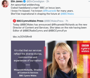 The tweet today from the PC MS for Ceredigion Elin Jones, says it all: “Am apwyntiad ardderchog. Cwbwl haeddianol a mae’r BBC yn lwcus iawn. I know I’m biased. I’ve known @Rhuanedd for many years. She’ll be inspirational in shaping the future at @BBCWales”.