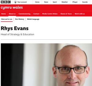 The BBC CW website declares that he “leads the development and implementation of strategic and policy issues for BBC Wales as well as being responsible for the delivery of its educational mission. He’s also responsible for the BBC Wales archive which is currently being transformed through a major digitisation programme”.