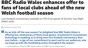 Calling Mr Paterson ‘Head of BBC Radio Wales and BBC Cymru Wales Sport‘, he is quoted as saying: “As we kick off the new season I’m delighted that BBC Radio Wales is offering live commentary of these local games. Investment in transmission technology is enabling us to bring more live football commentary than ever before – a sign of our commitment to sport and to our audiences, who can keep up with the footballing action throughout the season”.