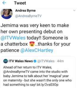 Edwin Phillips reads a Press Release from ITV Cymru Wales about their presenter Andrea Byrne after telling us news of her ‘magical year on maternity’ following enthralling updates on her baby’s progress in her column in a glossy magazine pushed through the doors of Cardiff homes.