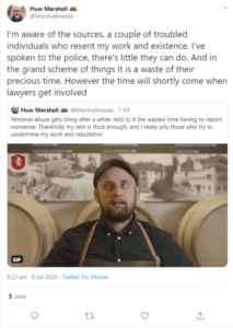 Mr Marshall also says he has contacted the police but that there is little they can do as “it is a waste of their precious time”, and “I really pity those who try to undermine my work and reputation”.
