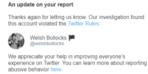 It was found that his account “Welsh Bollocks” had also broken the rules.