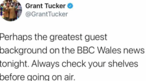 The picture was greeted by an enormous number of comments on social media, with one Twitter user saying: “Always check your shelves before going on air”, and it made headlines in UK newspapers.