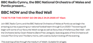 BBC Radio Cymru and the BBC National Orchestra of Wales are staging the ‘Red Wall’ at Pontio in Bangor to mark “the amazing journey supporting our national football team through Euro 2020”.