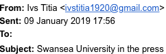 The libellous gmail was sent once more using a fake address from ‘Your friend’ to staff at Swansea University, the Chair of its council, leading Welsh journalists including ourselves, along with the First Minister of Wales, marked ‘Vanitas Vanitatum’.