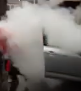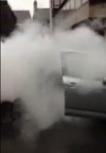In the clip now on YouTube, Mr Owens escapes from the car running, but Mr Davies uses the fire extinguisher again as the person filming it exclaims in Welsh “OH, NO!”.